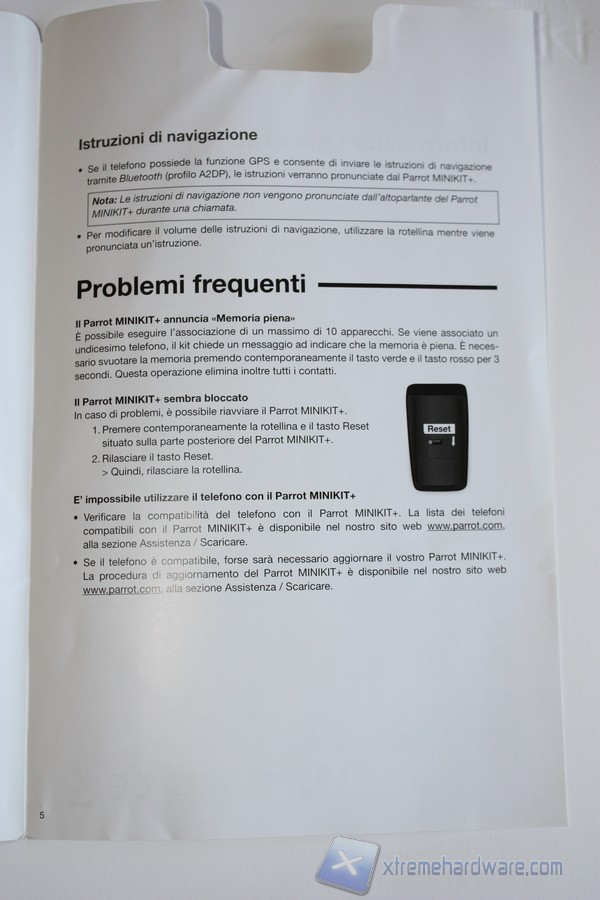 A seguire illustriamo le pagine che compongono la Guida d’uso al Parrot MINIKIT+.La Guida d’Uso è in Italiano e ci illustra nonché riassume in pochi semplici passi le funzionalità principali del Parrot MINIKIT+. La guida risulta essere facilmente consultabile da chiunque senza problemi.